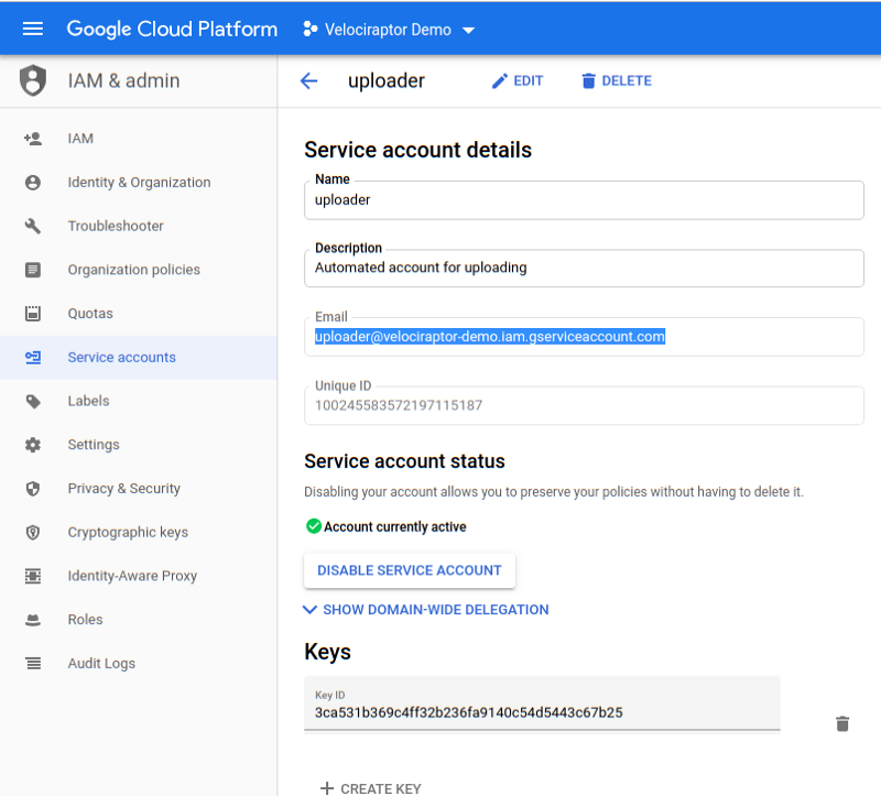 "client_x509_cert_url": "https://www.googleapis.com/robot/v1/metadata/x509/uploader%40velociraptor-demo.iam.gserviceaccount.com"