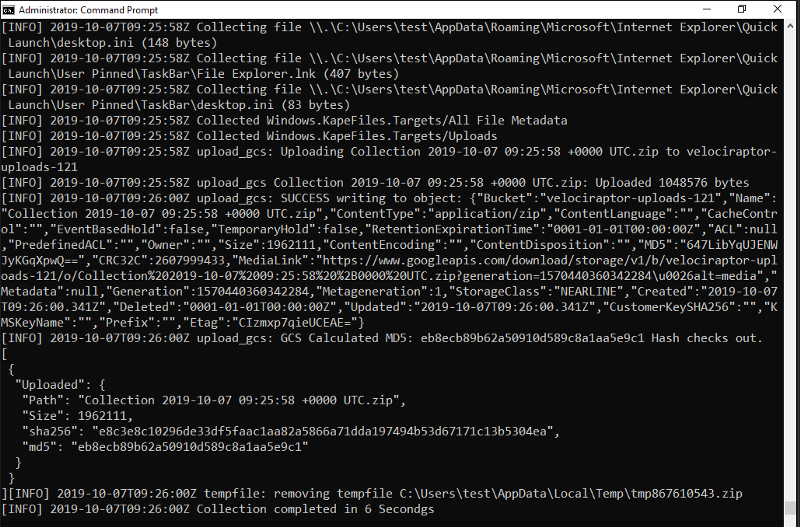 The below screenshot shows the debug log from running the collector. We can see the container finalized, then uploaded to GCS with its hashes calculated. When Velociraptor uploads the container to GCS, Google’s server calculate the md5 and return it together with other object attributes. Velociraptor then compares this hash to the one it calculated before to ensure the file landed properly on the cloud bucket.