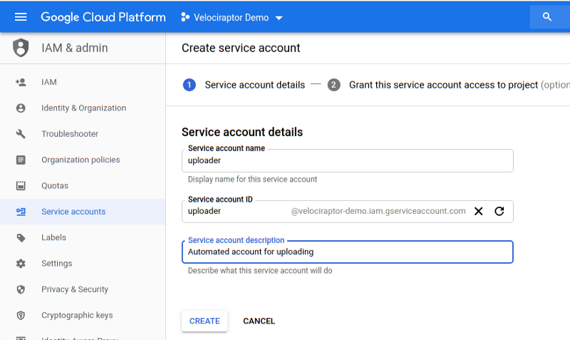 In order to do this we need a service account with credentials allowing it to upload to our bucket. Go to IAM & Admin / Service Accounts / Create Service Account: