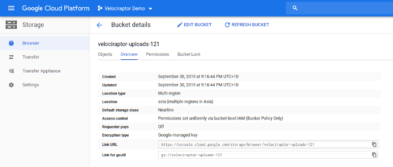Before we can upload files to a bucket we need to have a project in place. For this example I created a new project called “velociraptor-demo”: