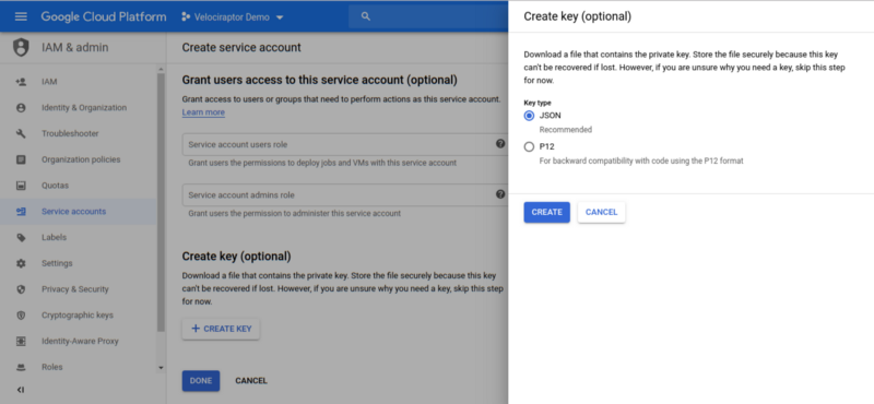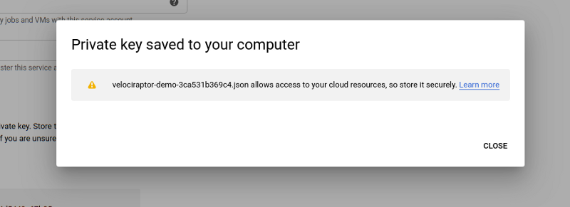 Since the service account will be able to upload by itself (i.e. the user does not authenticate on its behalf), we need to identify it with a JSON key. The key allows Velociraptor to act as the service account on this cloud project. Clicking the Create button will download a JSON file to your system with the private key in it.