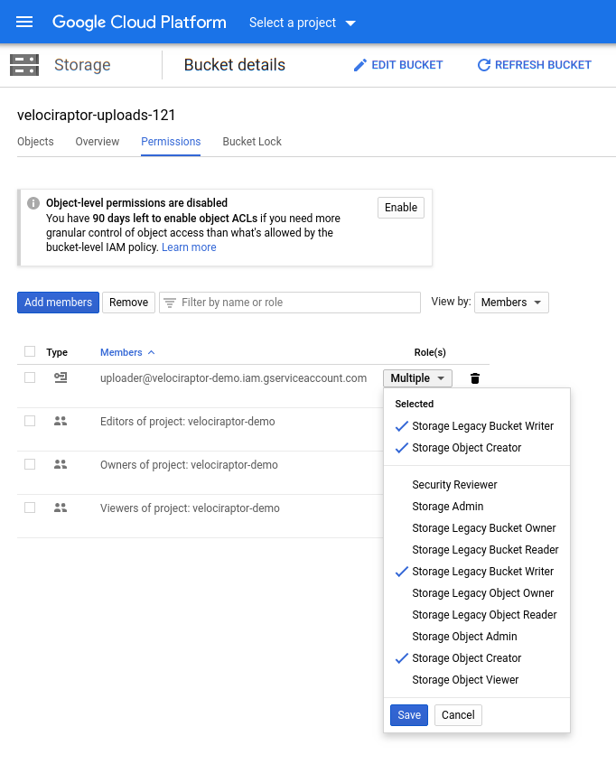 Selecting the “Permissions” tab, we are able to add the service account as a member — we will only give it the ability to write on a bucket and create new objects. This is important since is means that the service account is unable to read or list objects in this bucket. Since we will embed the service account key in our config file we need to make sure it can not be misused to compromise collections from other machines.