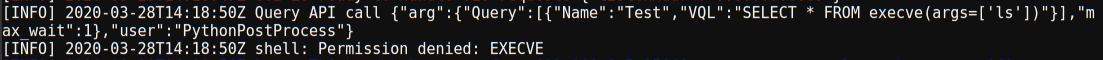 Velociraptor solves this by introducing a permission system. Each VQL plugin requires the caller to possess a particular permission. For example, the execve() plugin required the EXECVE permission (i.e. being allowed to run arbitrary shell commands). If the user does not have the permission, the plugin fails with an error.