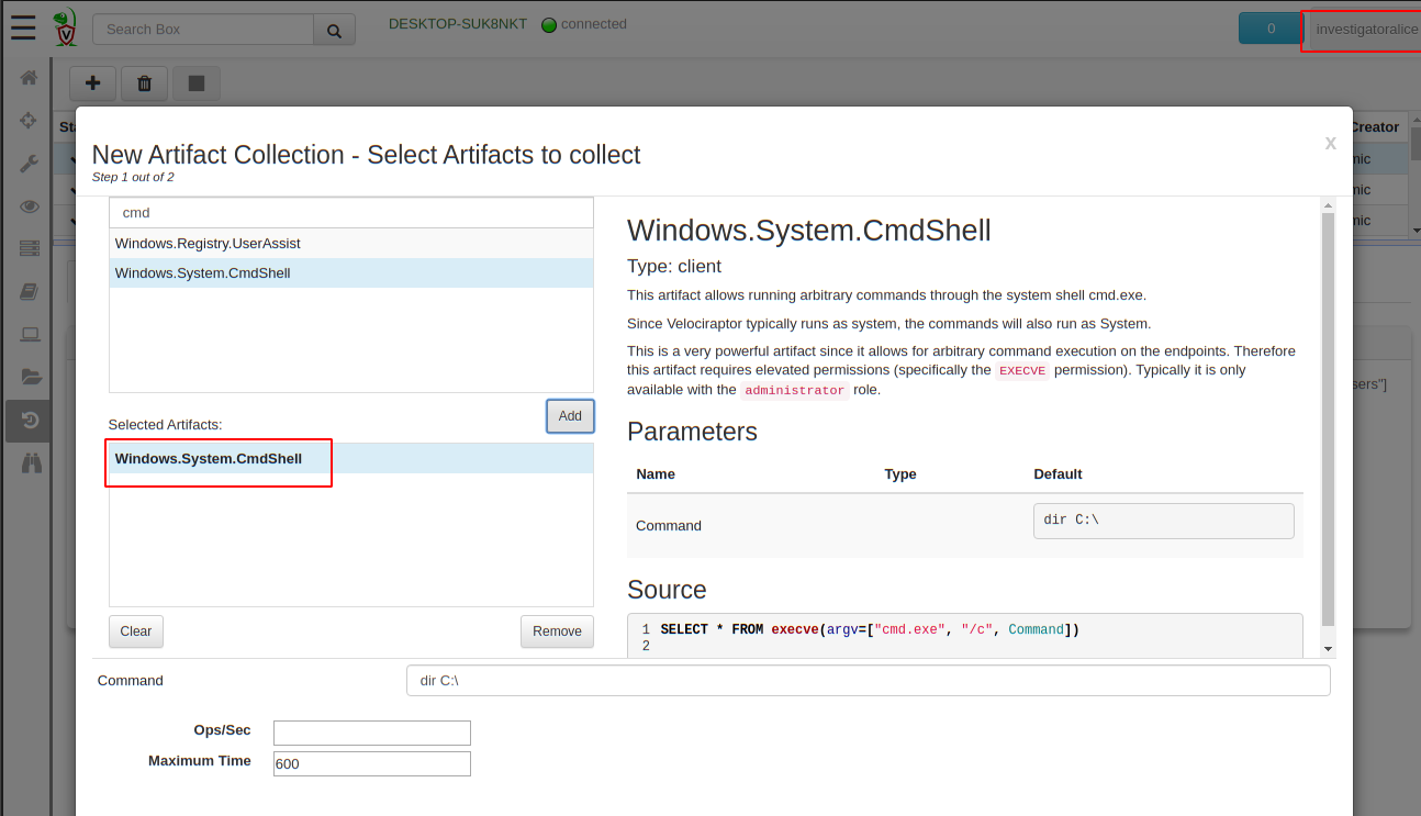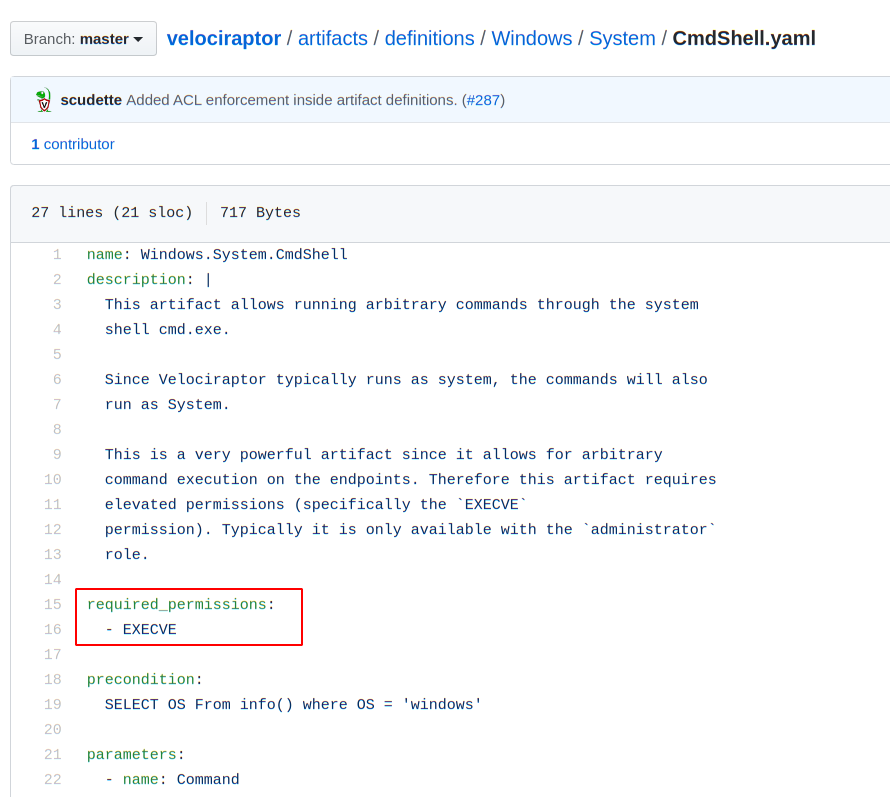 Some artifacts are more sensitive than others. For example, the Windows.System.CmdShell artifact implements the interactive shell feature. It allows arbitrary commands to be executed by the command shell on the endpoint — a very powerful artifact indeed.