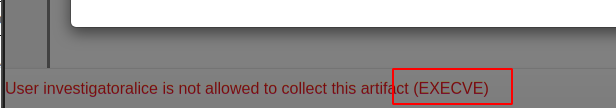 The artifact definition itself specifies that this artifact requires the EXECVE permission. Let’s see what happens when investigatoralice attempt to collect that artifact.