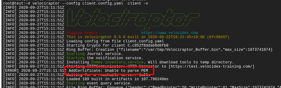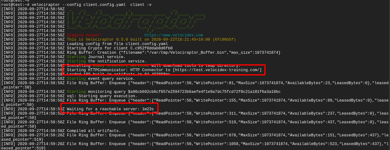 In the above example, I ran the client manually with the -v switch. I see the client starting up and immediately trying to connect to its URL (in this case https://test.velocidex-training.com/ ) However this fails and the client will wait for a short time before retrying to connect again.