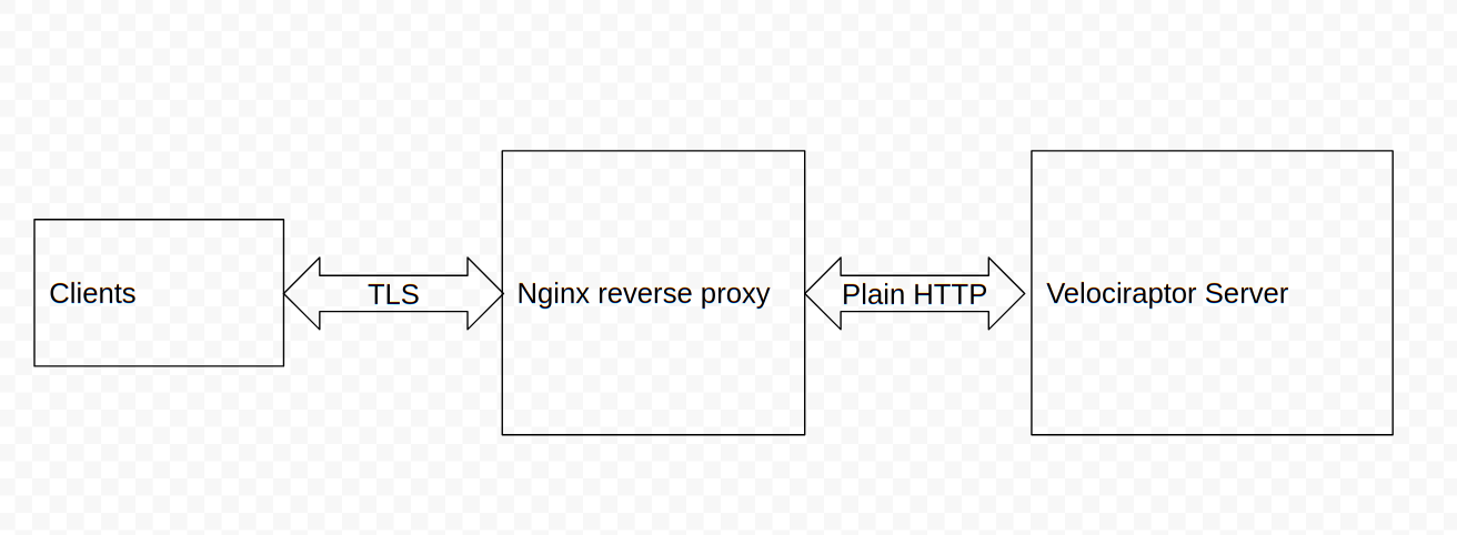 In this example, we will show how nginx can be used to terminate the TLS connections and then forward plain HTTP connections to the Velociraptor server (Many cloud provides also offer a cloud version of an SSL load balancer). This setup is also suitable if you want to use standard certificates (i.e. not Let’s Encrypt ones).