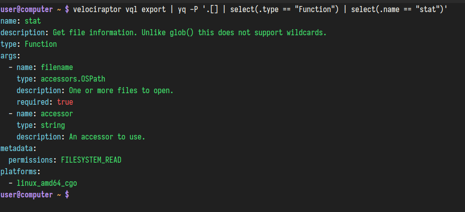 velociraptor vql export | yq -P '.[] | select(.type == "Function") | select(.name == "stat")'