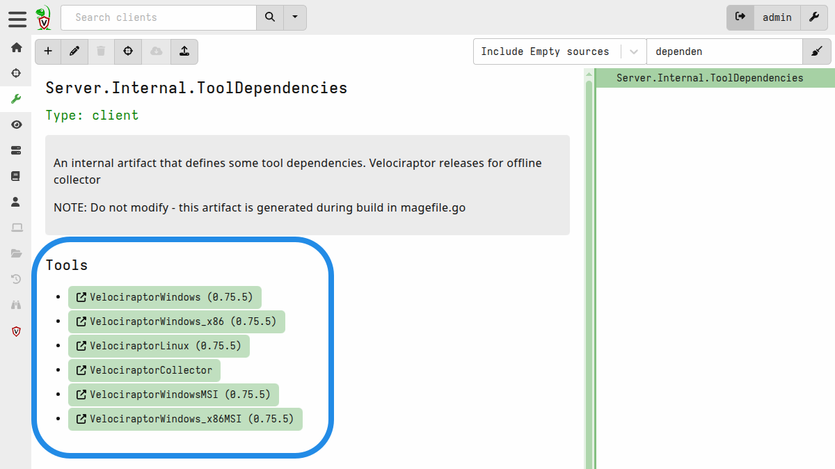 The Velociraptor binaries that will be used for creating offline collectors are themselves defined as tools in the Server.Internal.ToolDependencies artifact. This is a built-in artifact that is updated with each Velociraptor release.