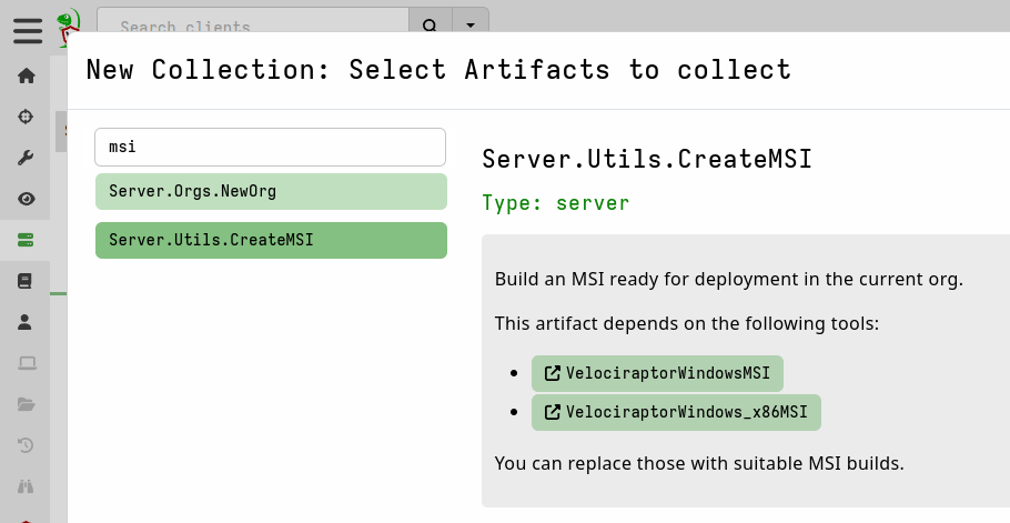 We publish a prebuilt MSI package on our GitHub Release page, however since the Velociraptor client requires your unique configuration file which is linked to your server, we don’t package a working configuration file in the official release MSI. The official MSI contains a placeholder configuration file. You will need to modify the official release MSI to include your client configuration file, and this is easily done through a process we call “repacking”. We have a streamlined process for generating a custom MSI package which can be done entirely in the Admin GUI. This is the quickest and easiest way to generate the MSI package, and so it’s the one we will use here.