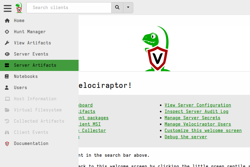 Returning to your Velociraptor server, you can find the newly enrolled client by clicking the button in the “Search clients” bar at the top of the page.