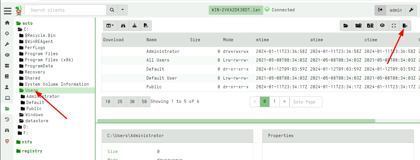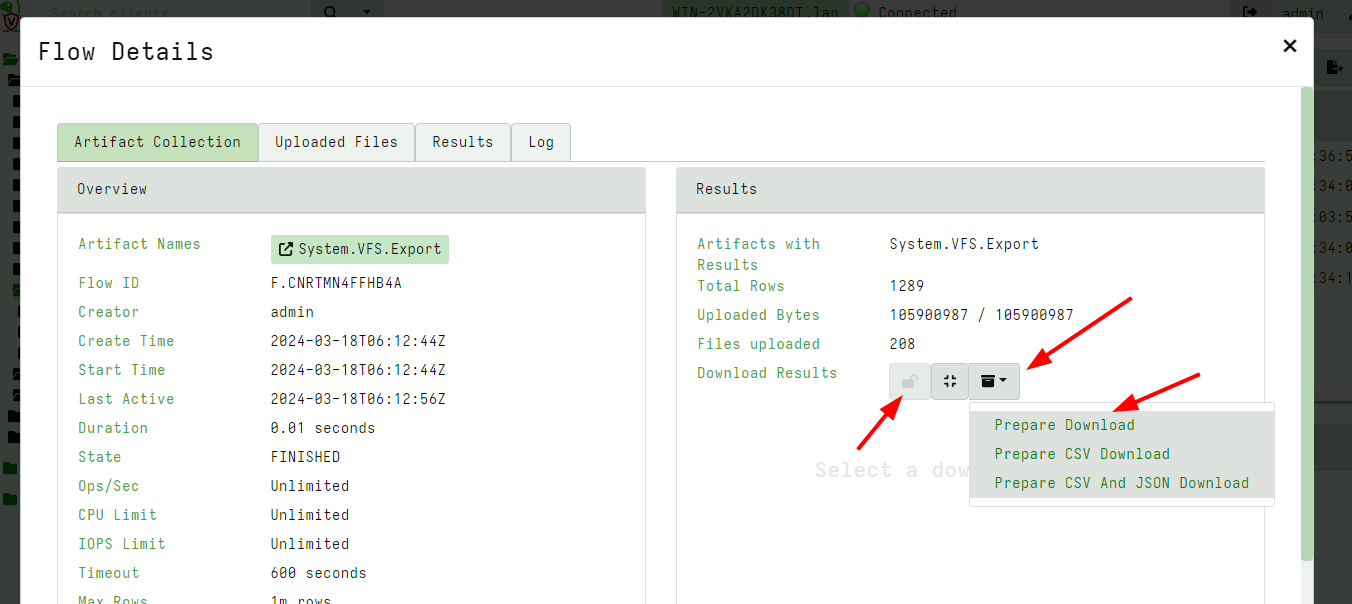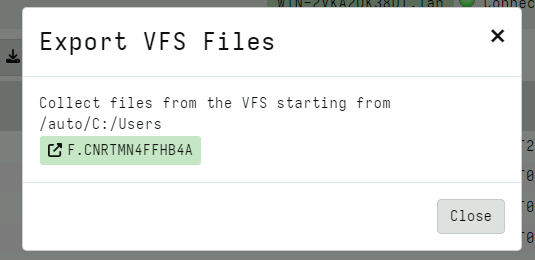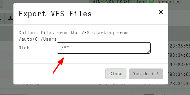 Hit the export button - this will start a server collection to take a snapshot of the vfs - you can set any filtering globs (so for example don’t export all the files - maybe only *.exe).