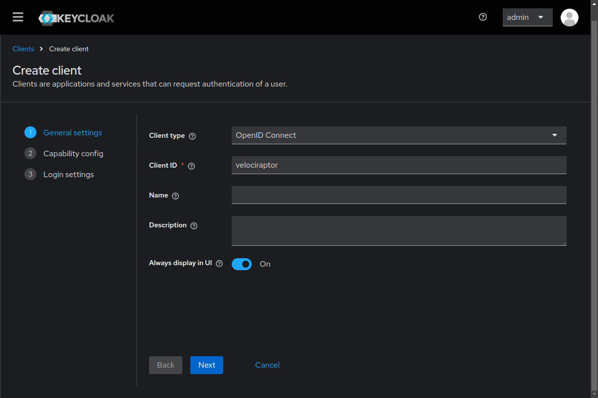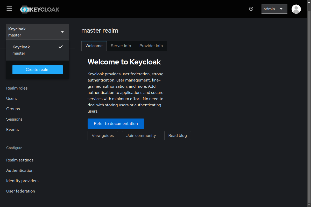 Next we go through the steps that are almost the same as described in Keycloak’s Getting started guide.