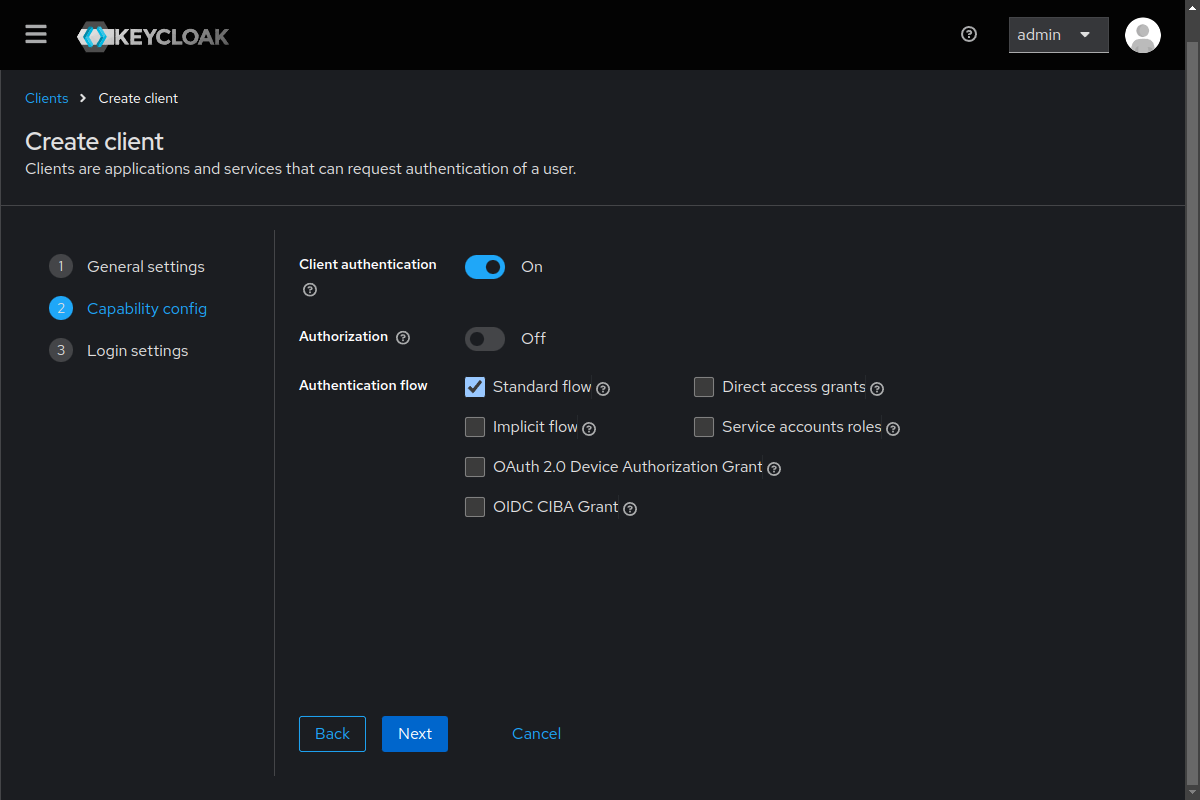 On the second page, choose Client authentication: ON and Authentication flow: Standard flow (only). Then click Next.