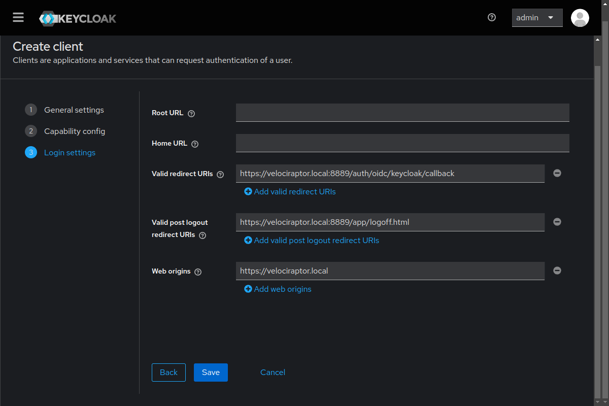 https://velociraptor.local:8889/auth/oidc/keycloak/callbackhttps://velociraptor.local:8889/app/logoff.htmlhttps://velociraptor.localThen click Save. Your OIDC client configuration is now created.