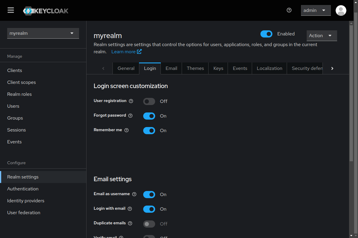 The next action is to configure email addresses as login usernames. To do that navigate via the sidebar to Realm settings > Login tab. Ensure that Email as username and Login with email are enabled. The additional user preferences shown in the following screenshot are optional and in your case would be determined by your organizational policies.