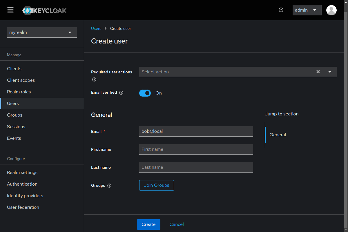 other fields are optional. I also selected Email verified to avoid an email