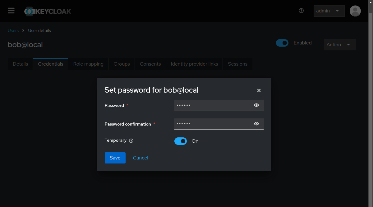 After creating the account, go to the Credentials tab and set a password. Note that we leave Temporary:ON set so that the password must be changed on first logon. Note also that this is a simplified demonstration so for that reason we’re ONLY using password auth while Keycloak easily supports multi-factor authentication.